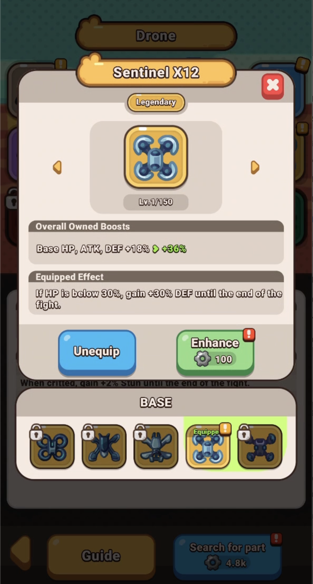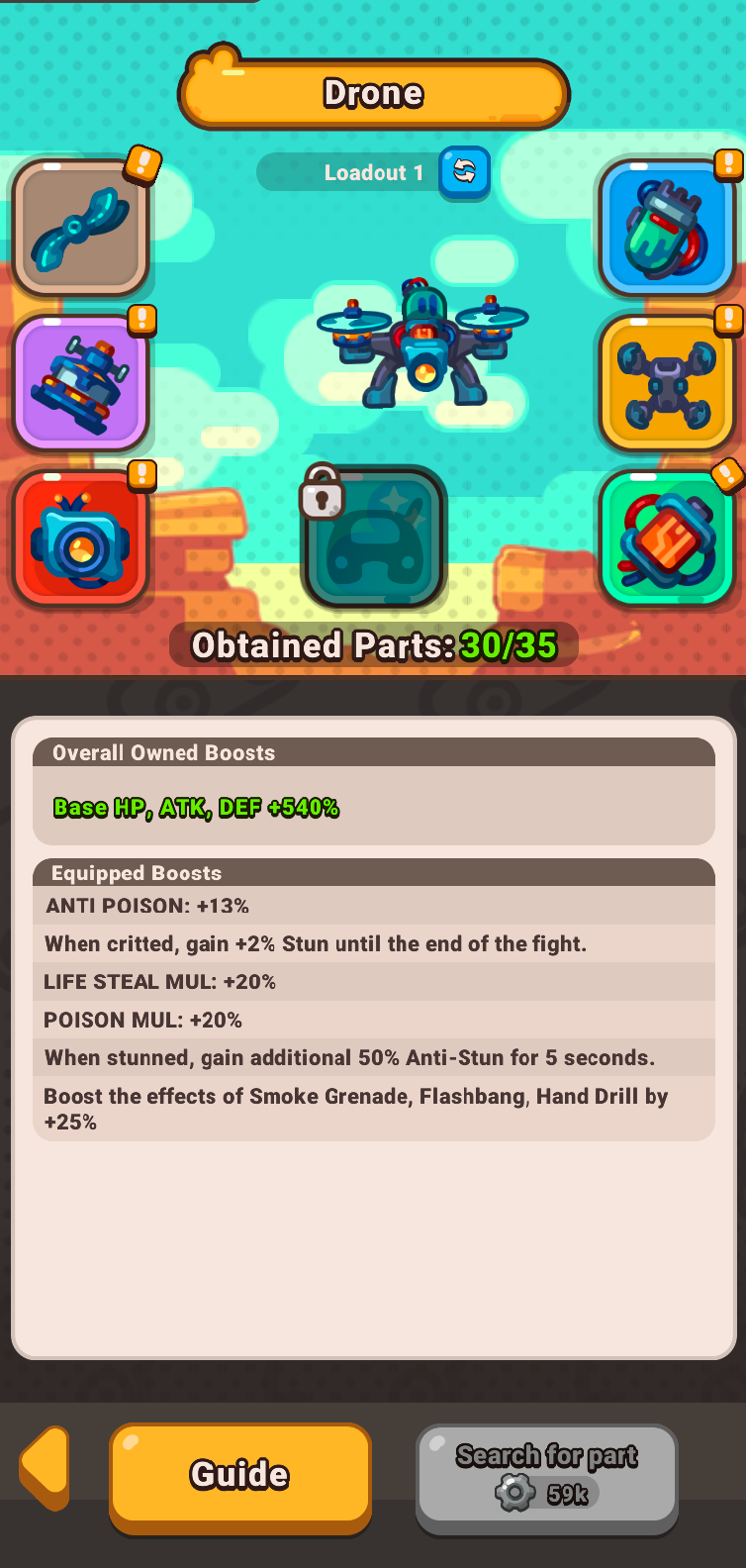 IMPORTANT Note of advice for existing players.If you are upgrading from existing account, we will give you a lot of drone gears to spend, but we want you to be informed first. This is important! When you start a new version of the game, it maybe tempting to just spam search for new part button, and spend all your drone gears on that, but at that level - this may be suboptimal, as you will not get the needed boost to HP, ATK and DEF that you need.An advice from the rockbite team here is to spend 30-40% of your gears on searching, then spend the rest on upgrading all the parts, so they are all more or less on same level. Even ones you didn't equip!